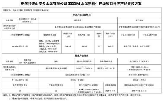 夏河祁连山安多水泥有限公司3000t/d水泥熟料生产线项目原设计产能2500t/d,补充产能500t/d,置换比例为2:1。重庆綦江西南水泥有限公司一条2500t/d水泥熟料线中的1000t/d用于本项目置换产能,该生产线计划2025年12月31日前拆除退出。