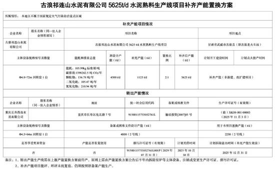 古浪祁连山水泥有限公司5625t/d水泥熟料生产线项目原设计产能4500t/d,补充产能1125t/d,置换比例为2:1。重庆长寿西南水泥有限公司一条4800t/d水泥熟料线中的2250t/d用于本项目置换产能,该生产线计划2025年12月31日前拆除退出。