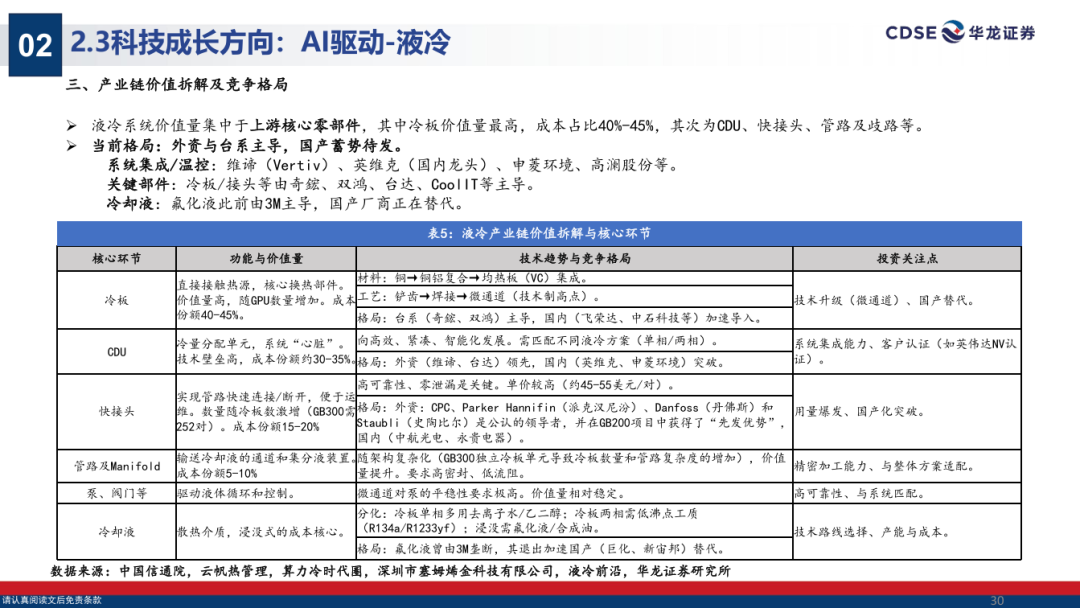 投资逻辑:核心驱动逻辑:从“风冷极限”到“液冷刚需”;根本驱动力:AI芯片功耗呈指数级增长;技术演进路径:三大路线并存,冷板式主导当前,浸没式节能效果更优;当前格局:外资与台系主导,国产蓄势待发。
