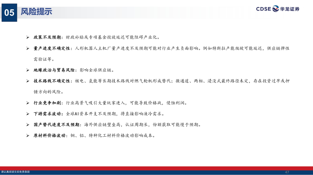 投资建议:短期投资看冷板放量,长期投资看技术变革与国产替代。建议优先关注已卡位主流赛道、具备全链条能力或关键部件技术优势、且正在突破海外大客户的龙头公司。个股:英维克(108.310, -2.28, -2.06%)(全链条)、申菱环境(66.250, 1.78, 2.76%)、高澜股份(31.140, 0.48, 1.57%)(浸没式)、同飞股份(90.090, -4.61, -4.87%)(工业温控专家,拓展数据中心液冷)、飞荣达(33.680, 0.37, 1.11%)(冷板)、中石科技(50.770, -0.58, -1.13%)(导热材料)、巨化股份(37.760, -0.11, -0.29%)(冷却液);铂力特(106.800, 0.58, 0.55%)(3D打印)、华曙高科(64.120, 1.02, 1.62%)(3D打印);曙光数创(75.190, -0.98, -1.29%)(浸没式)、新宙邦(53.210, -1.40, -2.56%)(氟化液);中航光电(35.270, 0.48, 1.38%)(连接器)。