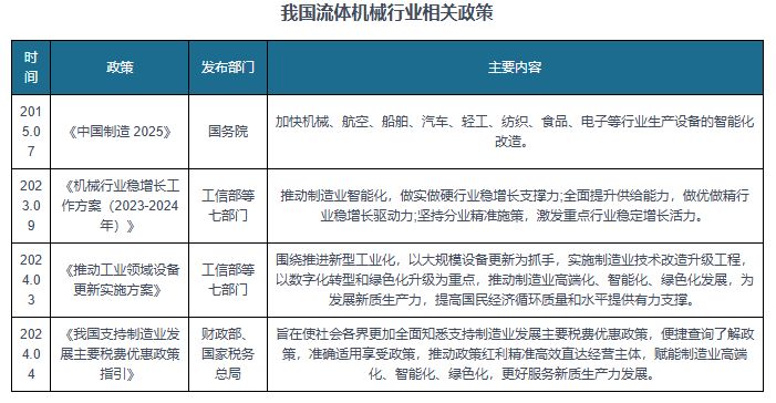 政策推动制造业发展,流体机械设备广泛受益。为支持流体机械行业的发展,政府出台了多项政策,涵盖技术创新、环保节能和智能制造等方面。