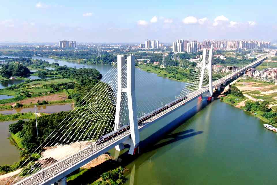 广汕高铁增江特大桥为双塔双索面混凝土斜拉桥,全长2569.48米,主跨260米跨越增江,是世界上首次采用大跨度节段预制混凝土主梁的高铁斜拉桥,也是世界上首次采用大跨度节段预制胶拼法施工的高铁桥梁。建设过程中,项目团队积极运用BIM技术,创新多种新技术和新工艺。其中,铁路斜拉桥节段梁采用的对称短线法预制技术、混凝土桥梁采用的“精密全站仪+3D扫描仪”技术均为世界首创,节段梁架设采用的边跨与中跨不对称同步架设为全国首创。