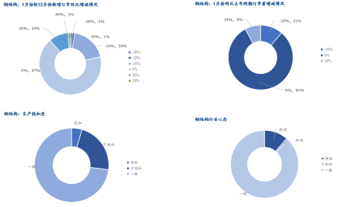 调研数据显示,钢结构行业持续性向利好方向发展,一月份维持上个月反季节性强势,仍有多数工地、工厂等加急赶工,采购量有所增加,企业备货较上月增加,造成企业原料上升,加快赶工进程。目前企业原料库存月环比上涨3.99%,项目整体开工以及消化有所上升,原料日耗月环比上涨0.37%,市场需求有所增加。