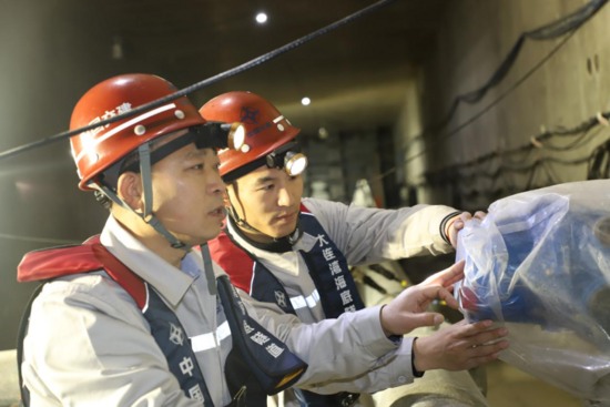 奋战在大连湾海底隧道一线的管延安(左一)。